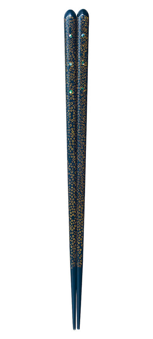 The bubbly motif is produced through a special technique called Tsugaru Nanako-nuri, where rapeseed is sprinkled over the chopsticks during the lacquering process. When the seeds are later scraped off, the circular impressions are left, producing its signature motif.