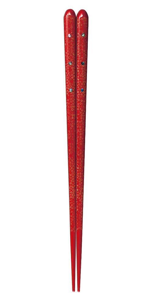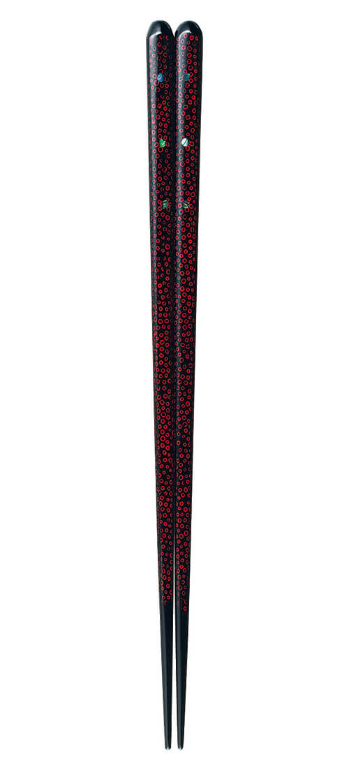 Its dotted motif is produced using a special technique called the Tsugaru Nanako-nuri, where seeds are sprinkled over the chopsticks during the lacquering process and later scraped off.