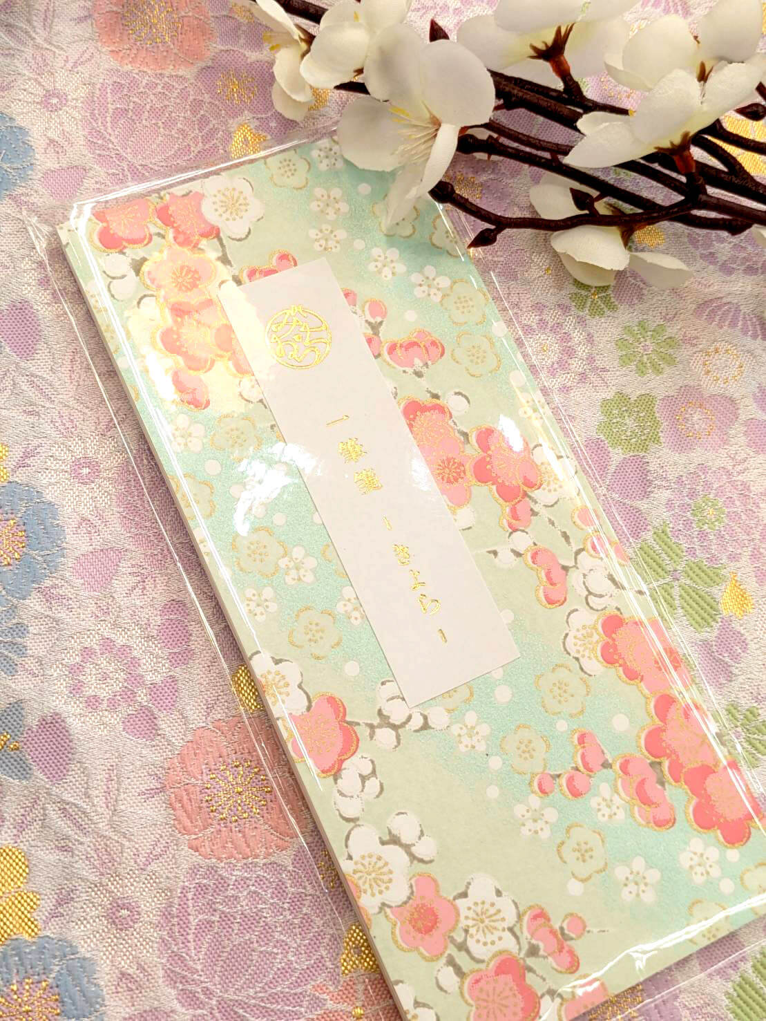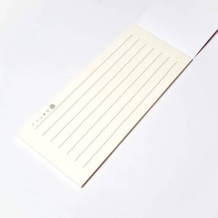 The writing paper uses Uzuki washi, known for its flowing patterns and smooth writing texture. At first glance it appears simple, but when it catches the light it reveals a subtle shimmer and refined beauty.