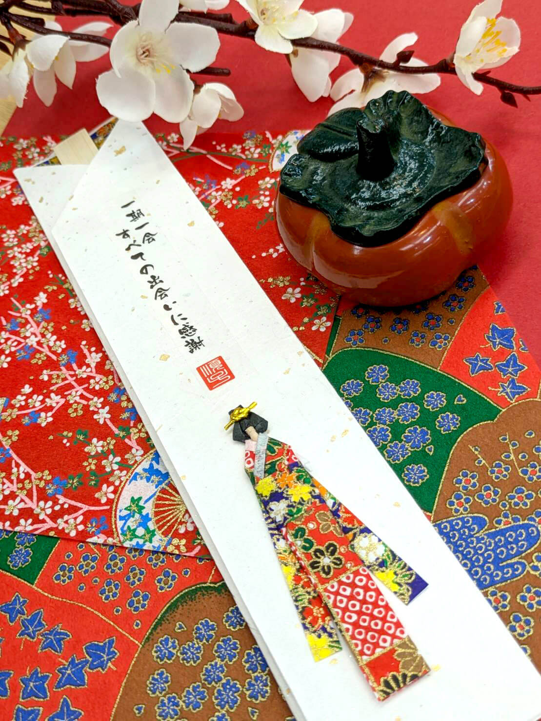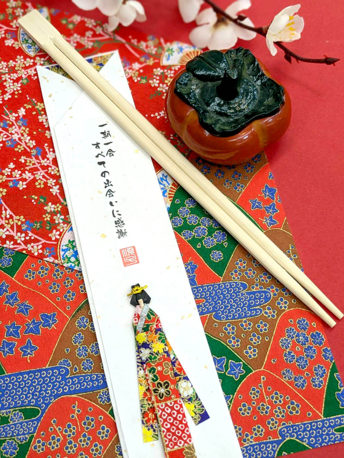 This chopstick holder features a doll made from carefully dyed Yuzen chiyogami paper.