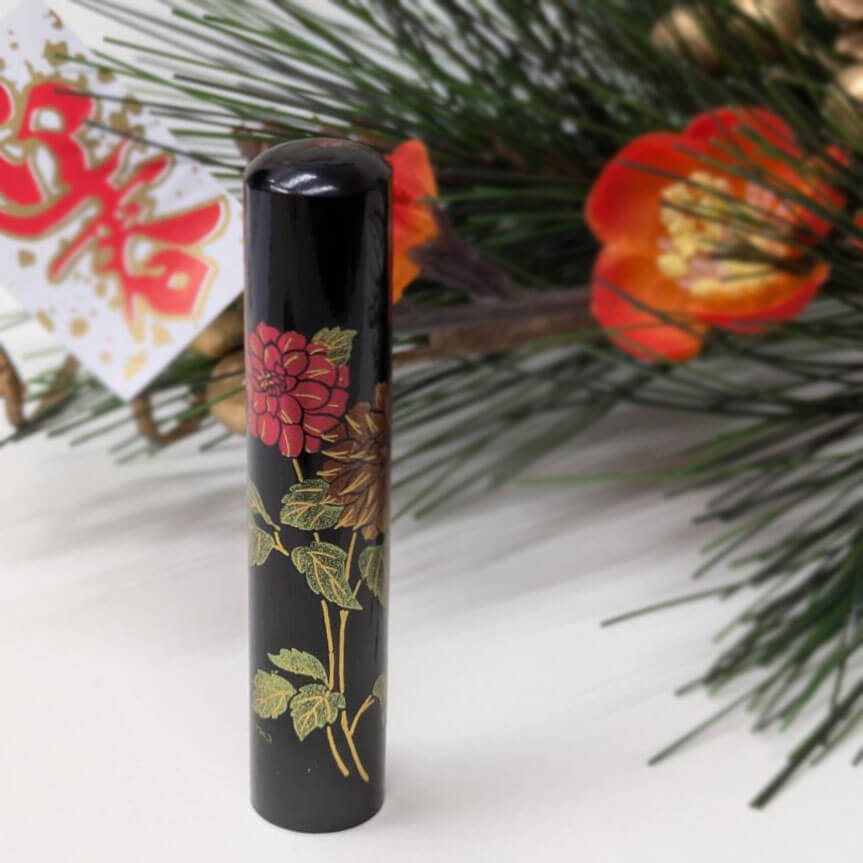 Makie is a unique Japanese lacquerware art, and is one of the most popular hanko styles in Japan. This style began during the Nara period (8th century). Patterns are drawn in lacquer, then powdered with gold, silver or tin, and then colored powders are gently sprinkled over the patterns to add color and dimension, as if sowing seeds. The “Maki” in “Makie” means to sow, a reference to this action.