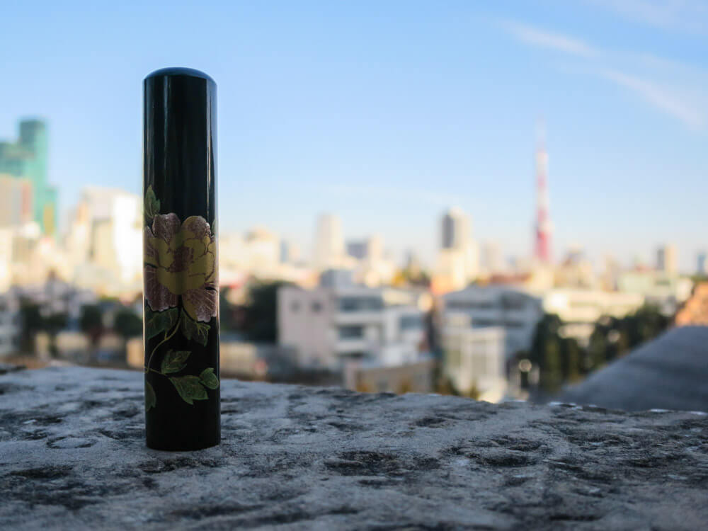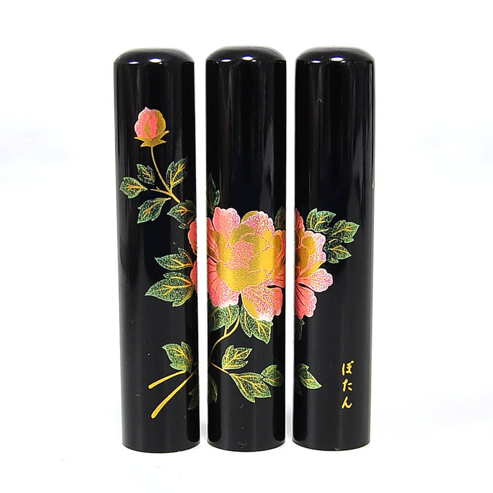 This gorgeous lacquered hanko is decorated with a flower motif featuring Peony. In Japanese, they are called Botan (ぼたん). In Hanakotoba (花言葉), the Japanese language of flowers, Peony embodies shyness and humility, and are common themes in flower art motifs.