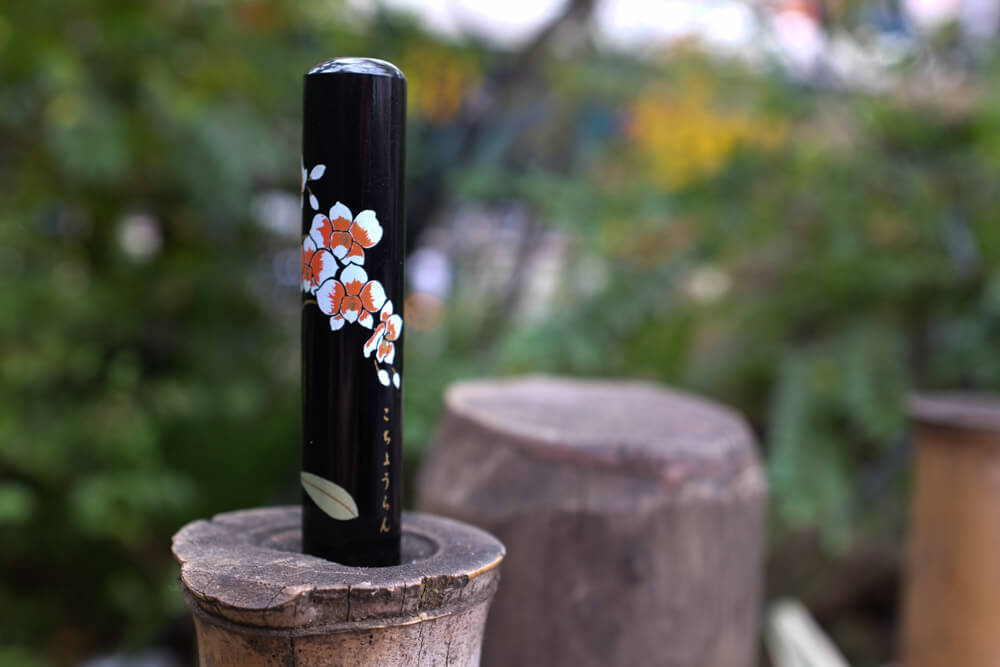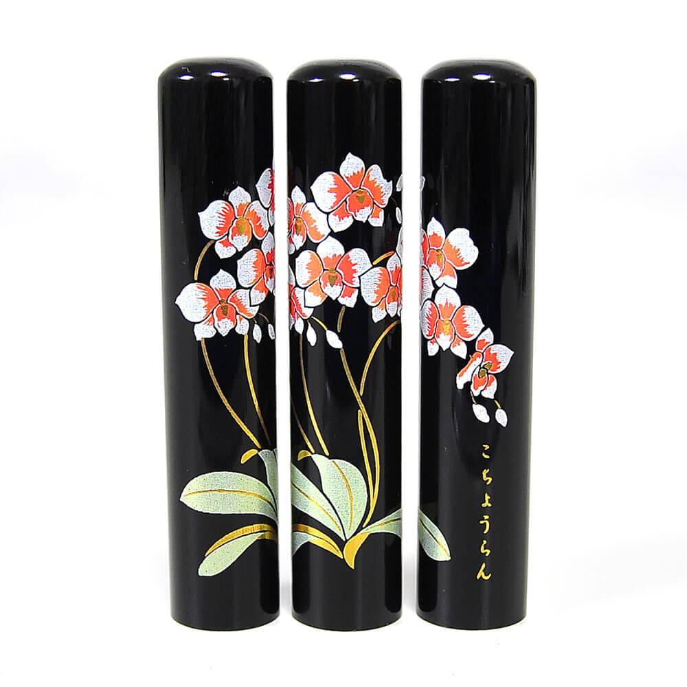 This gorgeous lacquered hanko is decorated with a flower motif featuring the Moth Orchid. In Japanese, this flower is called kochōran (こちょうらん、胡蝶蘭). In Hanakotoba (花言葉), the Japanese language of flowers, Moth Orchids carry are a sign of blessings to come. It is favored by those who have good fortune, or are in need of a change in fortune.