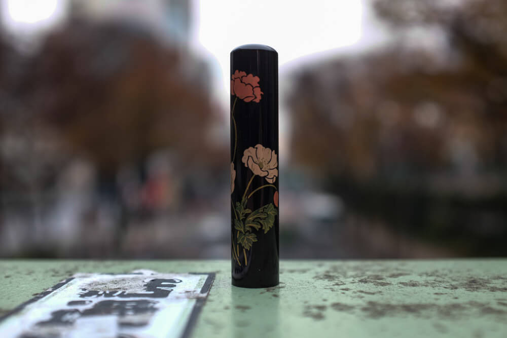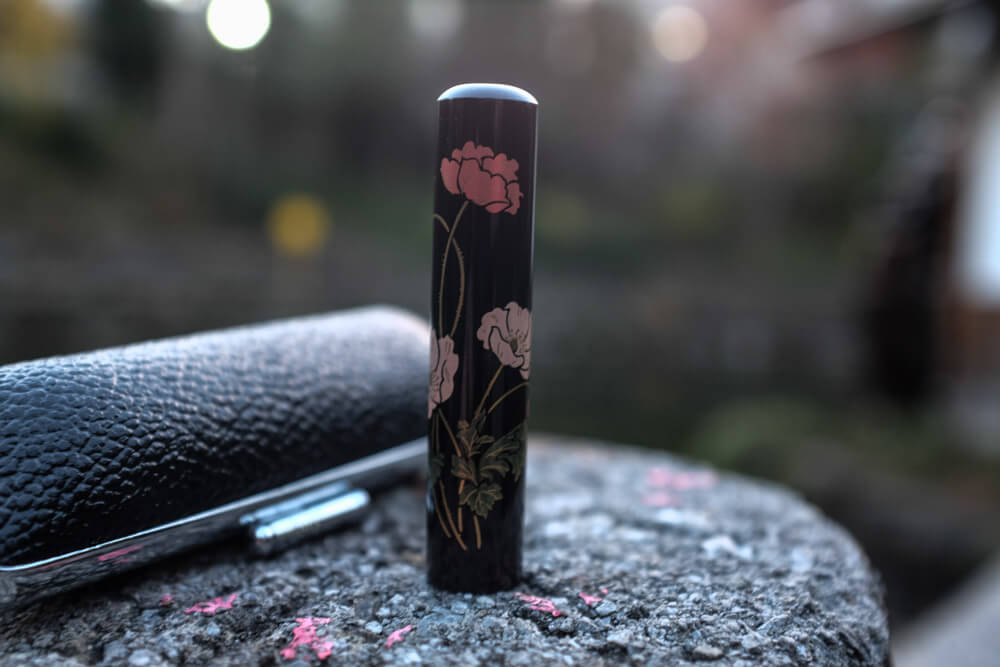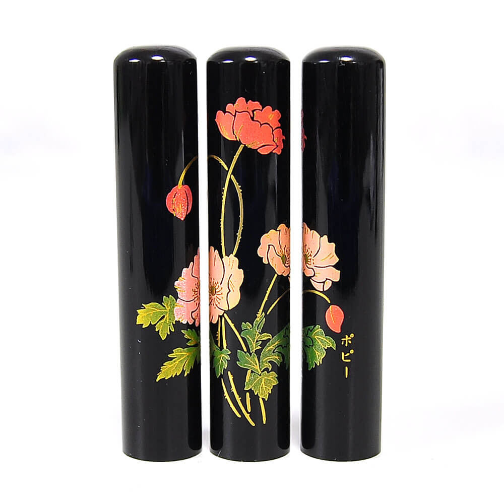 This gorgeous lacquered hanko is decorated with a flower motif featuring Poppies. In Japanese, they use the English pronunciation (ポピー). In Hanakotoba (花言葉), the Japanese language of flowers, Poppies have a variety of meanings, but are thought to represent new love and a sign of good weather in the future.