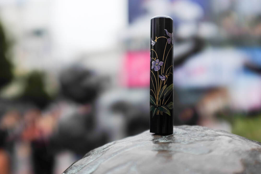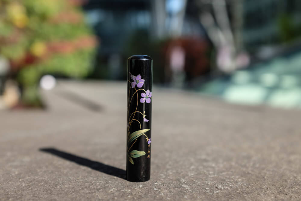 This gorgeous lacquered hanko is decorated with a flower motif featuring the Violet. In Japanese, they are called Sumire (すみれ). In Hanakotoba (花言葉), the Japanese language of flowers, Violet are flowers of honesty and small happiness. The violet has many different meanings, and also represent youth and beauty.