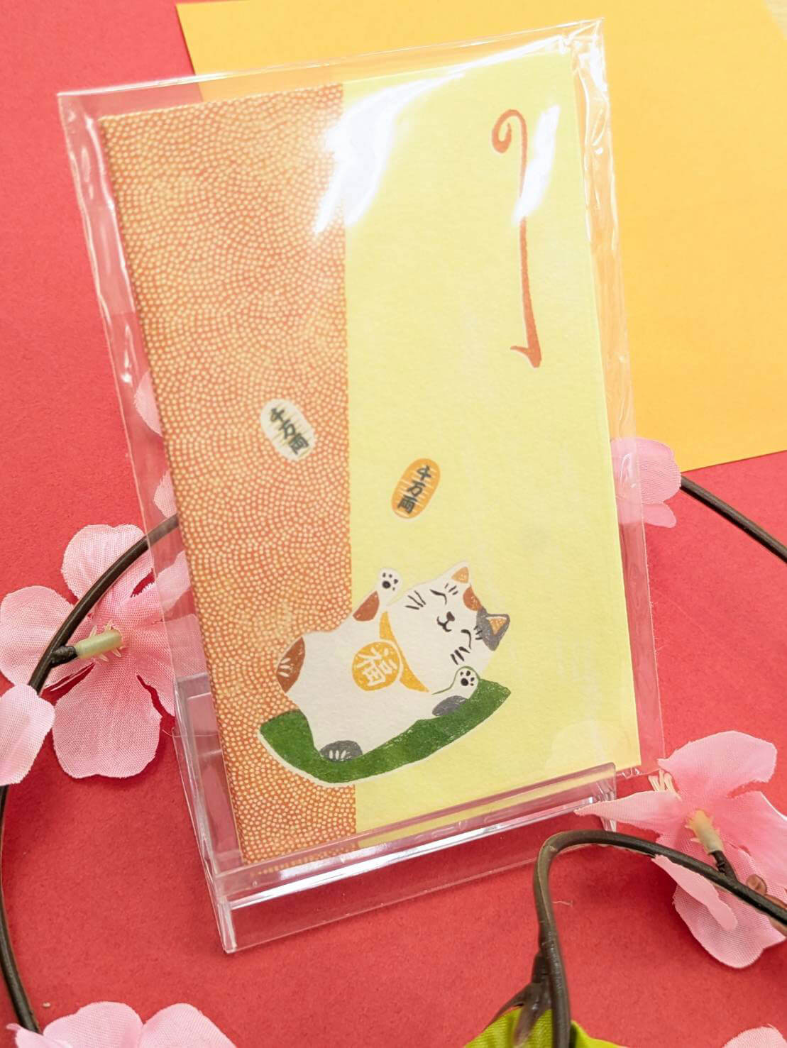 A small Japanese gift envelope featuring playful word designs and a Maneki-neko (lucky cat) motif.